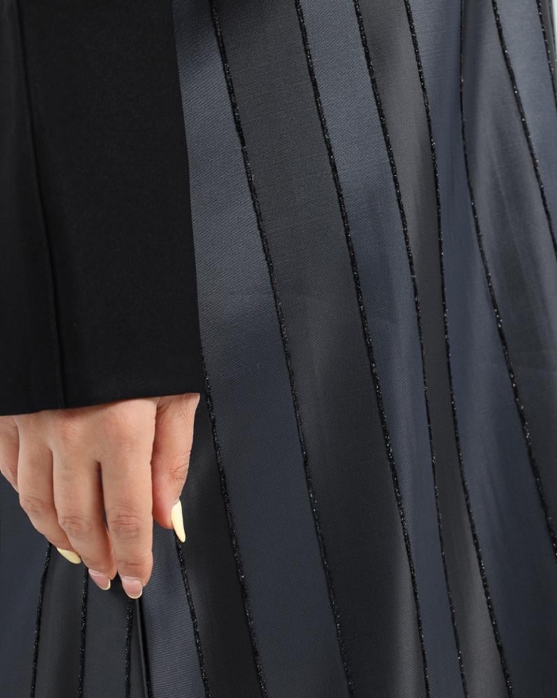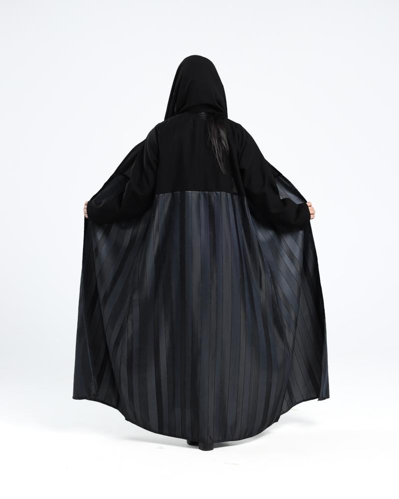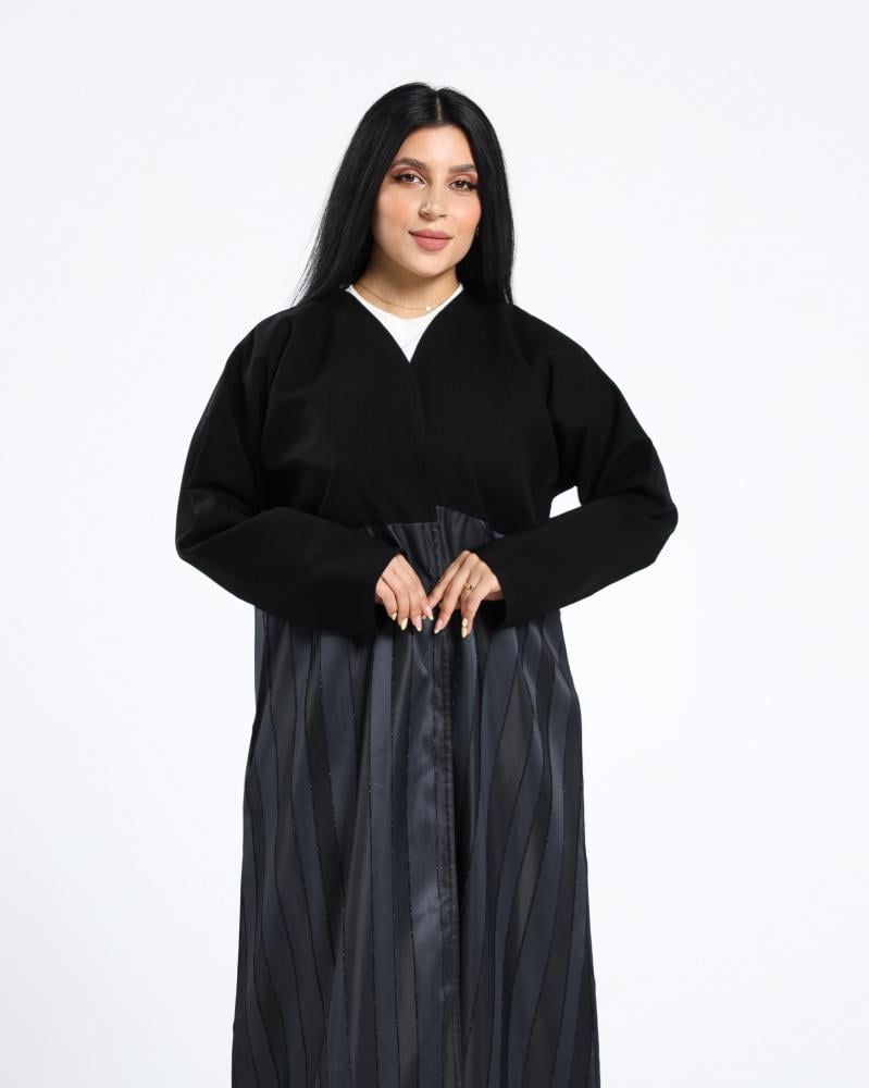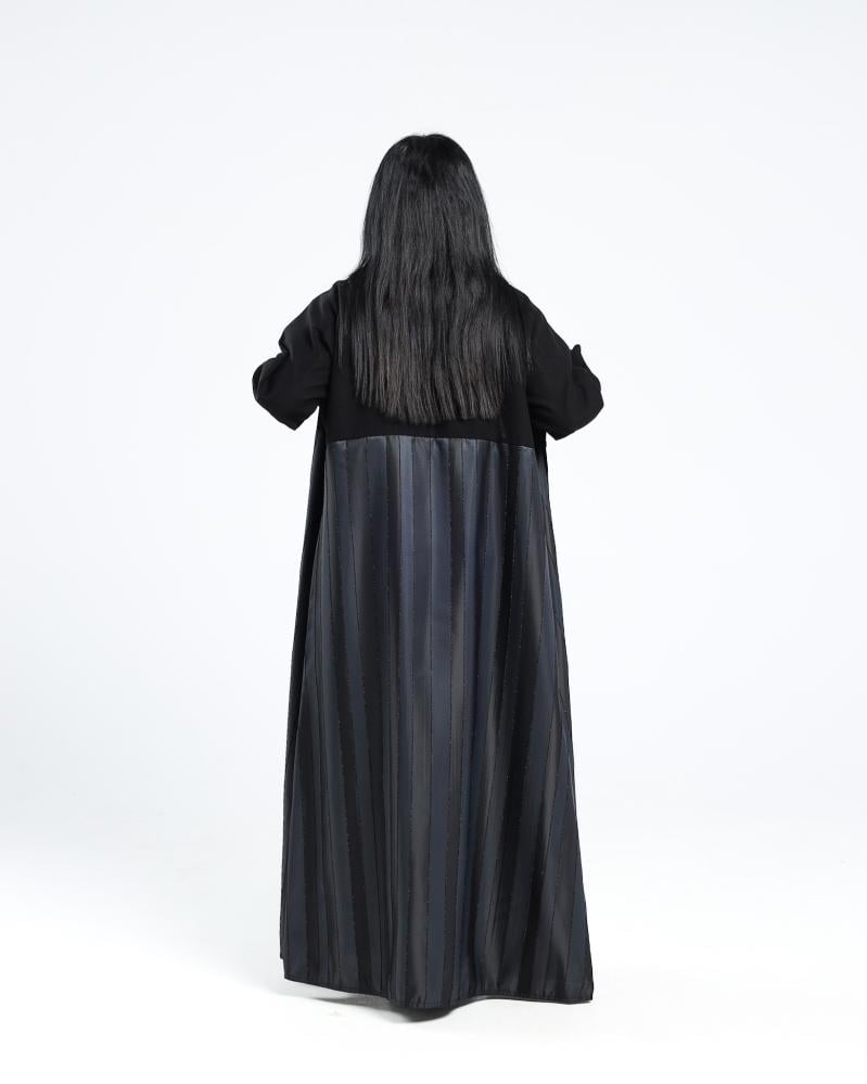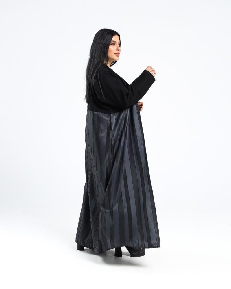 إطلالة فاخرة بتفاصيل جريئة، عباية تفته المزينة بأقمشة مخططة مائلة تمنحك مظهرًا عصريًا أنيقًا يلفت الأنظار. عباية تفته خيار مثالي للمرأة التي تحب التميّز دون التنازل عن الرقي.