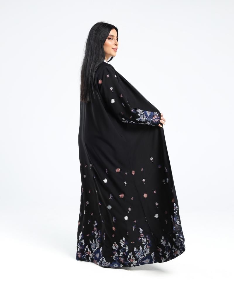 إطلالة أنيقة وعصرية تليق بذوقك الرفيع مع عباية دبل كلوش التي تجمع بين البساطة والفخامة بفضل التطريزات الدقيقة الممتدة على الأطراف والأكمام.